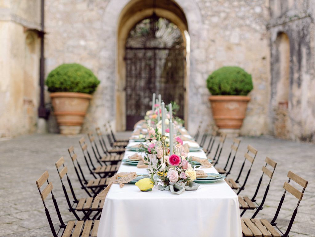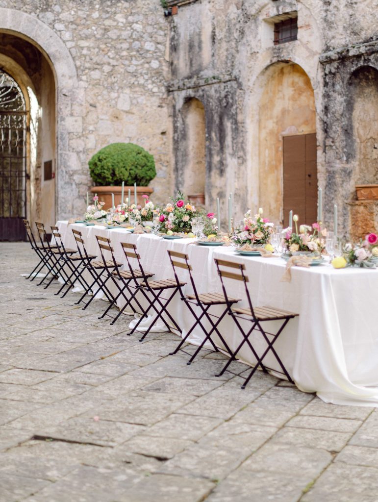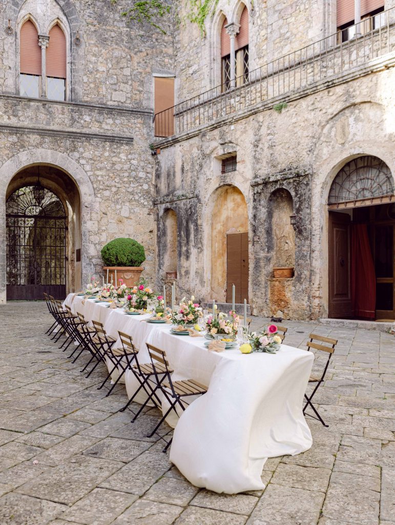 Al fresco dinner within the castle’s courtyard, with bride and groom’s portraits in the Italian garden