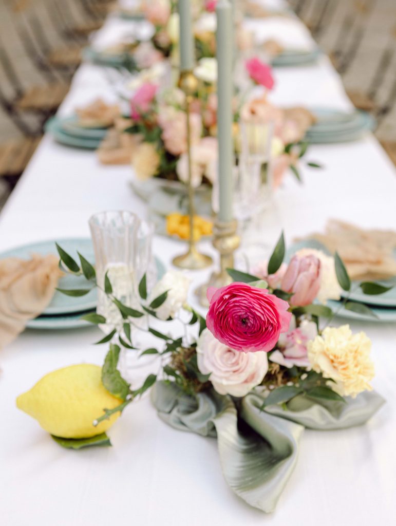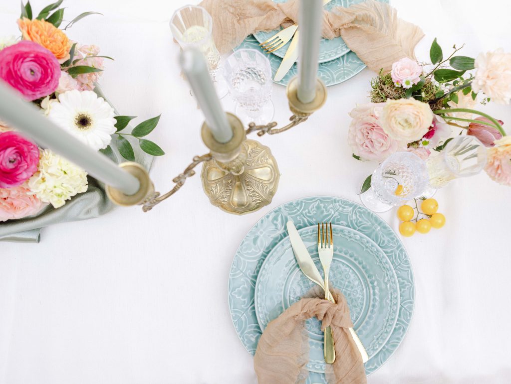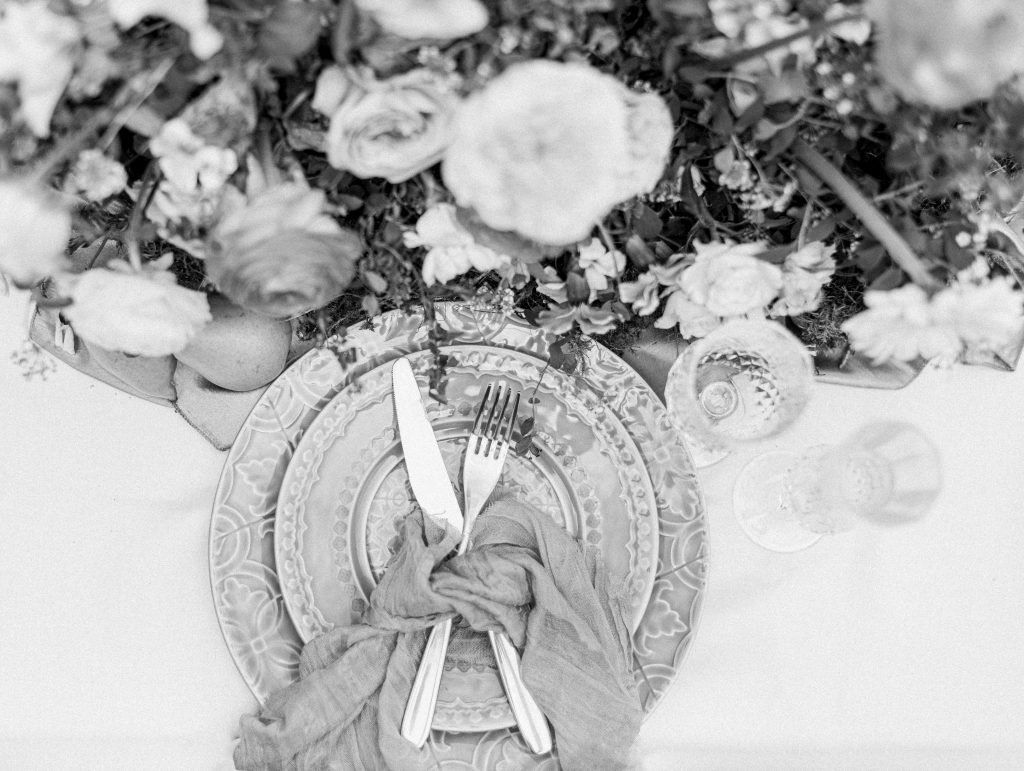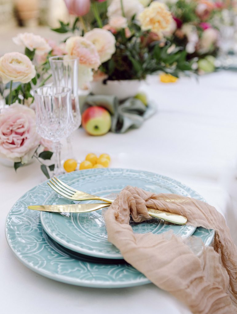 The tables were set within the castle’s courtyard, protected by the medieval walls. Dining in the open air, in the Tuscan countryside on a magical summer day feels like a dream. Your perfect al fresco summer dinner is complete with colorful flowers, blue dishes with golden cutlery, and elegant decorations.