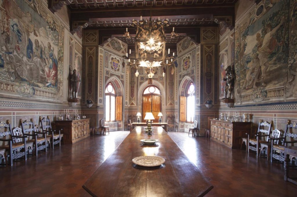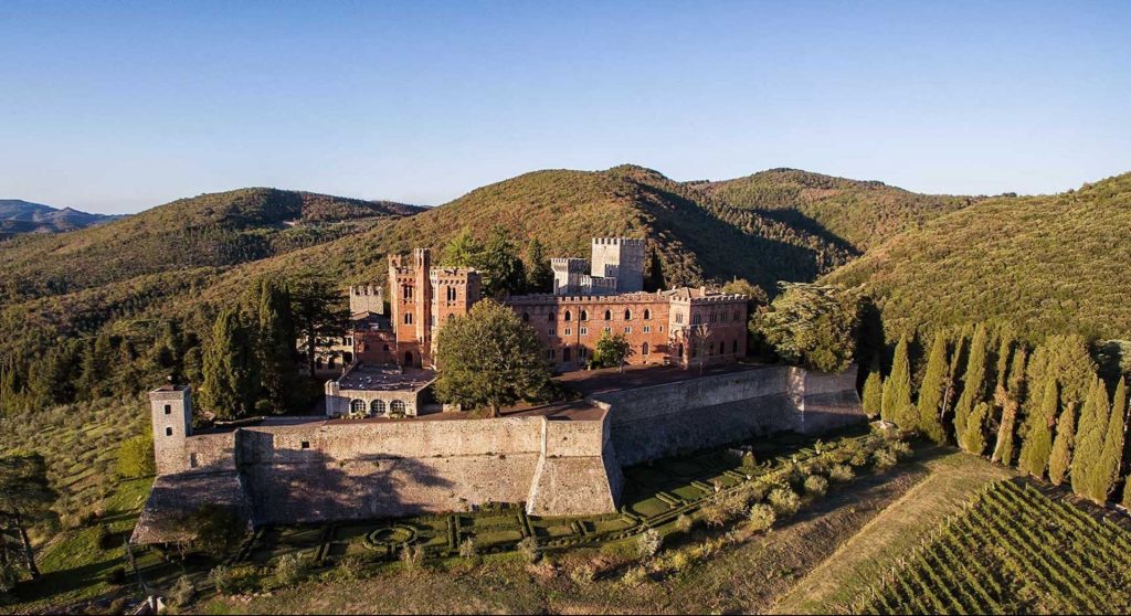 Views and Locations: Located near Florence, the castle offers panoramic views of the Tuscan landscape, including characteristic farms, castles, and cypress-lined hills.