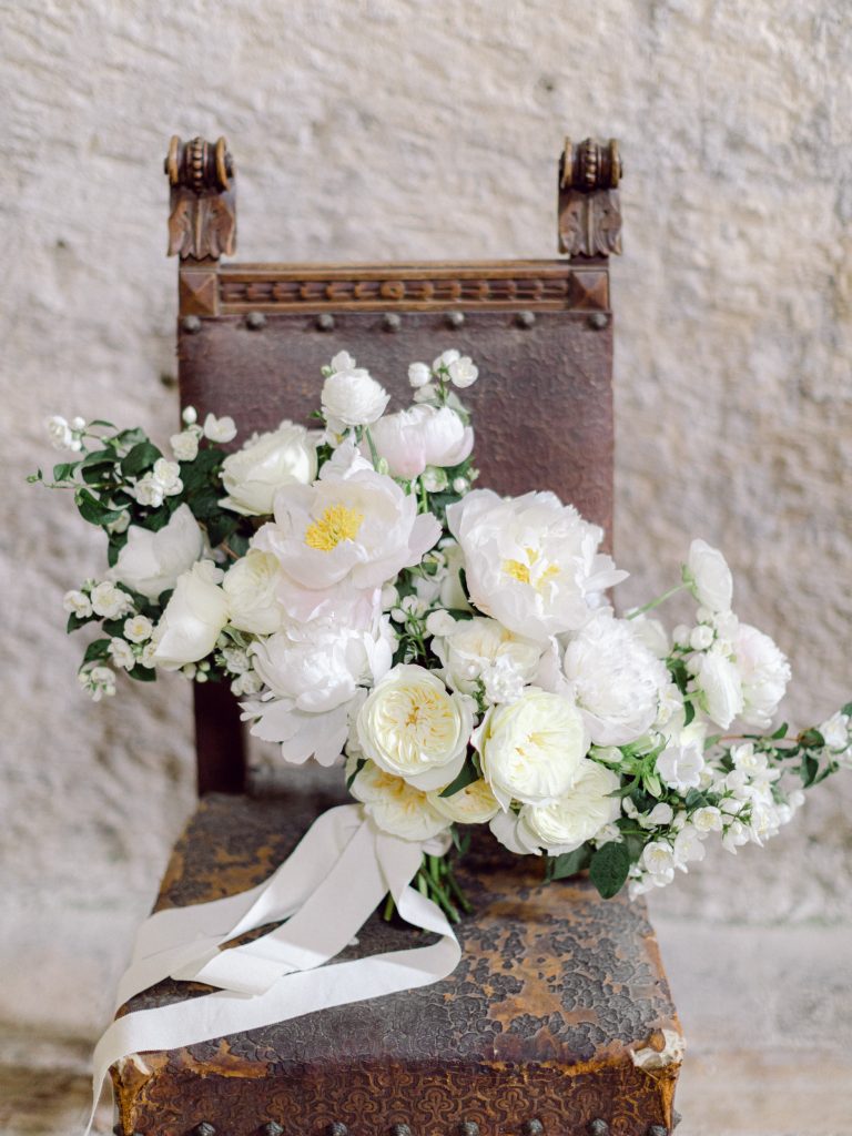 Designed by Janna Brown Design Co., this editorial drew inspiration from both the ethereal beauty of a Reem Acra gown and the earthy tones of the Umbrian landscape. The setting’s ancient textures—stone, fresco, and mosaic—perfectly complemented the soft lace and transparent elegance of the bridal look.