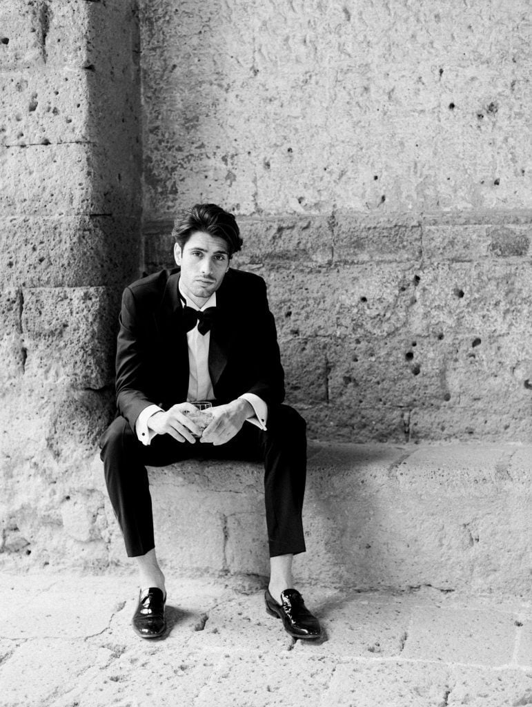 The groom’s portraits were equally evocative, taken inside a Romanesque chapel on the grounds. The mosaic floor—crafted from red porphyry and deep green serpentine stone—has survived for centuries. The refined architecture and historic flooring added gravitas to the morning’s quiet moments, highlighting the tailored elegance of his modern suit.
